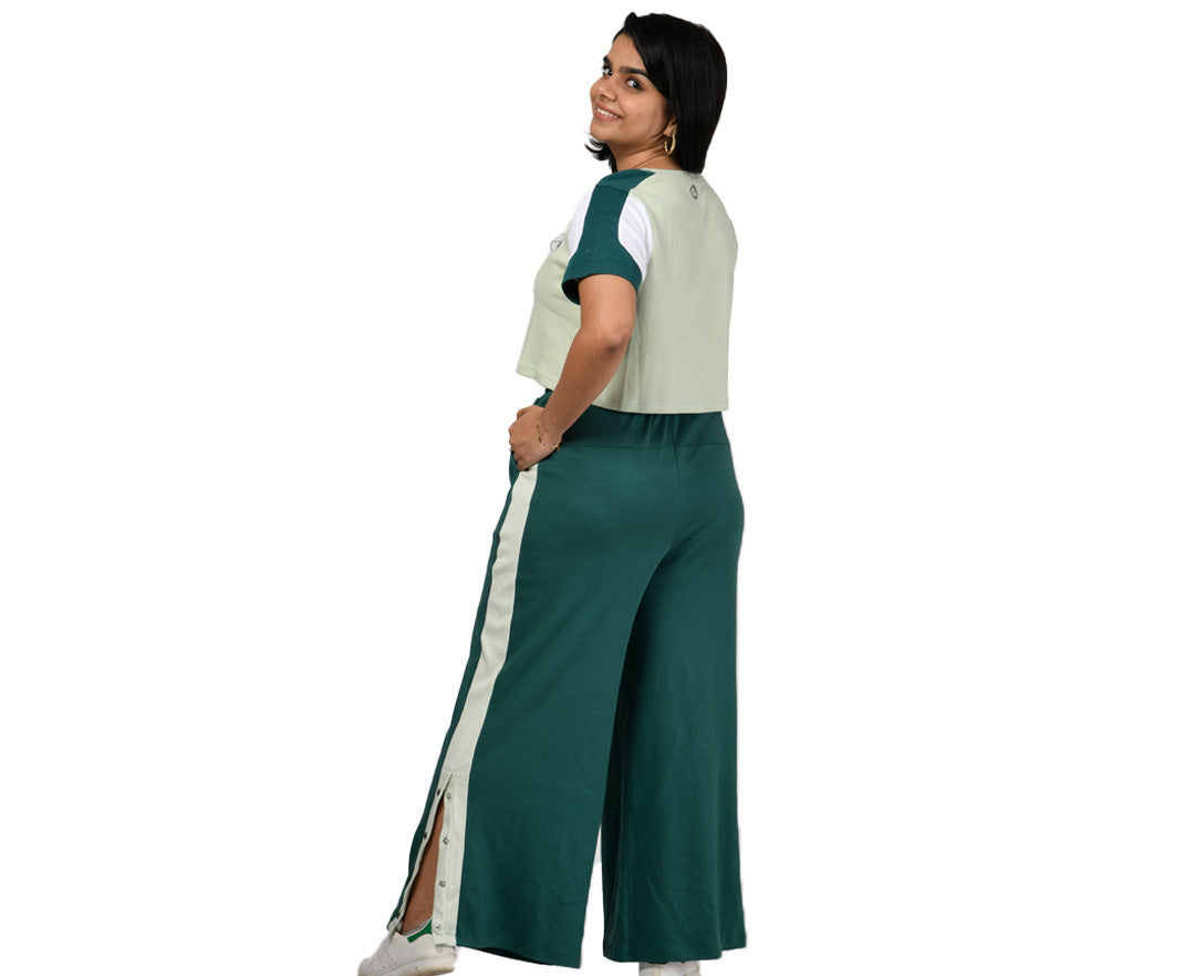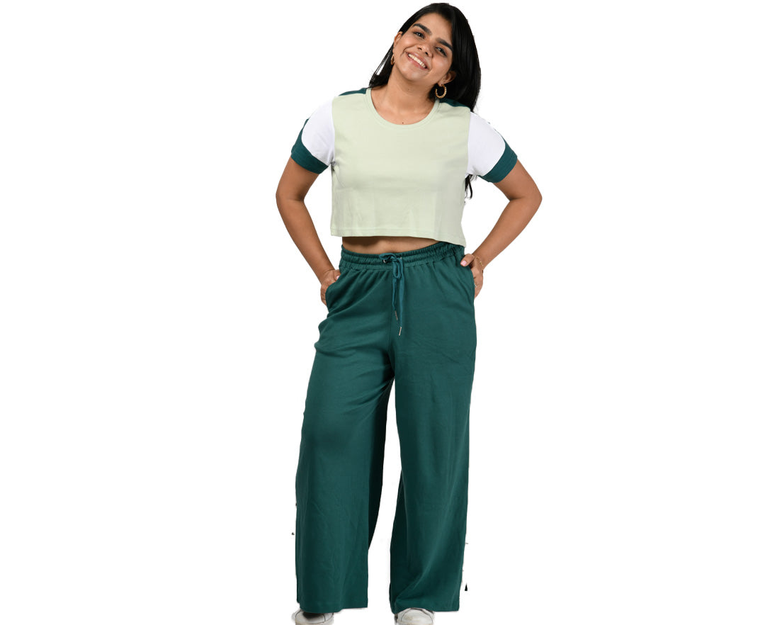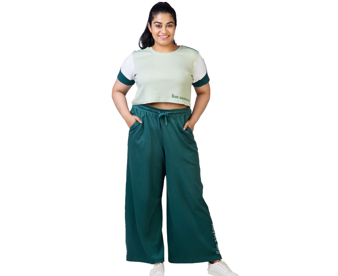 the 100% cotton interlock fabric, aasteyflow makes these cropped tees and wide leg trousers co-ord set for women extremely lightweight, breathable and durable. designed with the cotton interlock knit, the fabric assures that the co-ord set is thick for durability but also breathable and lightweight for all day movement and workout. the arms and legs of the co-ord set are specially designed with cut and sew detailing to give a stylish spin to your all-rounder look.