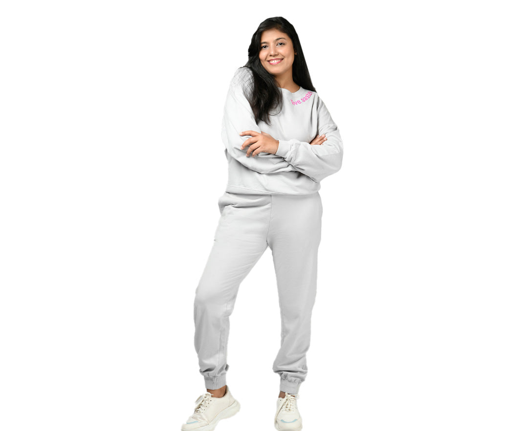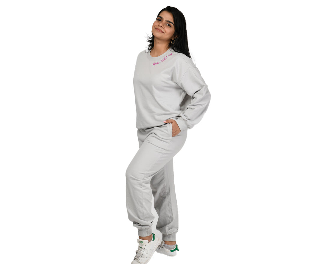 introducing, aasteybrushed, crafted with 100% cotton fleece which makes the women’s sweatshirt and joggers co-ord set extremely lightweight and comfy for any and all movement. curated with ribbed cuffs, waist and collar, it helps to keep the cold out and the warmth in to give you the snug fit for effortless movement. the soft, plush feel of the brushed cotton fleece is featherlight so you aren't burdened by any extra weight while you go about your usual day. the breathable, moisture-wicking fabric has the ability to keep you warm as well as give you some much needed air when you need it.